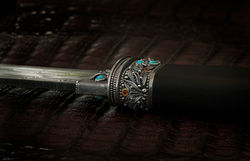 Handle: Gabon ebony, sterling silver, 14K gold, garnets, turquoise.