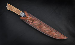 Sheath: vegetable tanned tooling leather, sterling silver, 14K gold, garnets.